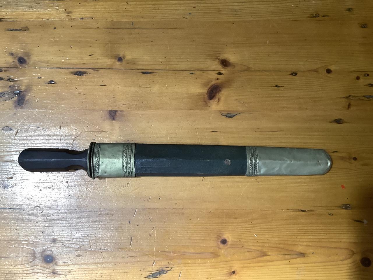 Posting a few pictures of a knife I inherited from my uncle, who passed many years back. I know he travelled to Nepal in the early 1980s and I assume he may have got it from there - but I don’t know. I was wondering if anyone could identify the likely origin or type of weapon? The blade has a false edge and quite a thick spine. The handle is dark wood. Scabbard almost has the pattern of skin, but could be paper based and the throat is wood. Metal (brass) parts on the scabbard are very thin and malleable with some decorative embellishments. The only marking can be seen in the attached photo - a swirl on the reverse of the scabbard. Hoping that someone can shine a light on the origin and age of this blade - as nobody in the family can recall its origin. Thanks in advance. |