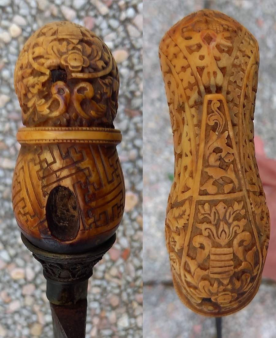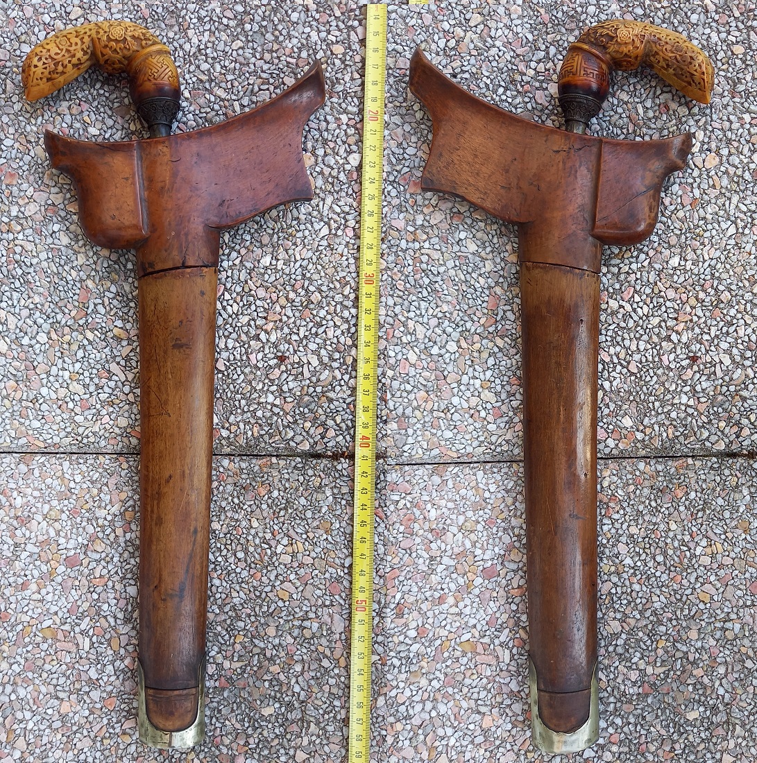 I have this Keris with a very nice ivory hilt, but I find the scabbard very unusual. I think the warangka isn't the original one because it seems to have been lengthened to fit the blade. The selut also seems more modern than the rest. I think it might be from Sumatra or Peninsular Malaysia, but I'd like to know if it's possible to have a more specific origin? |
