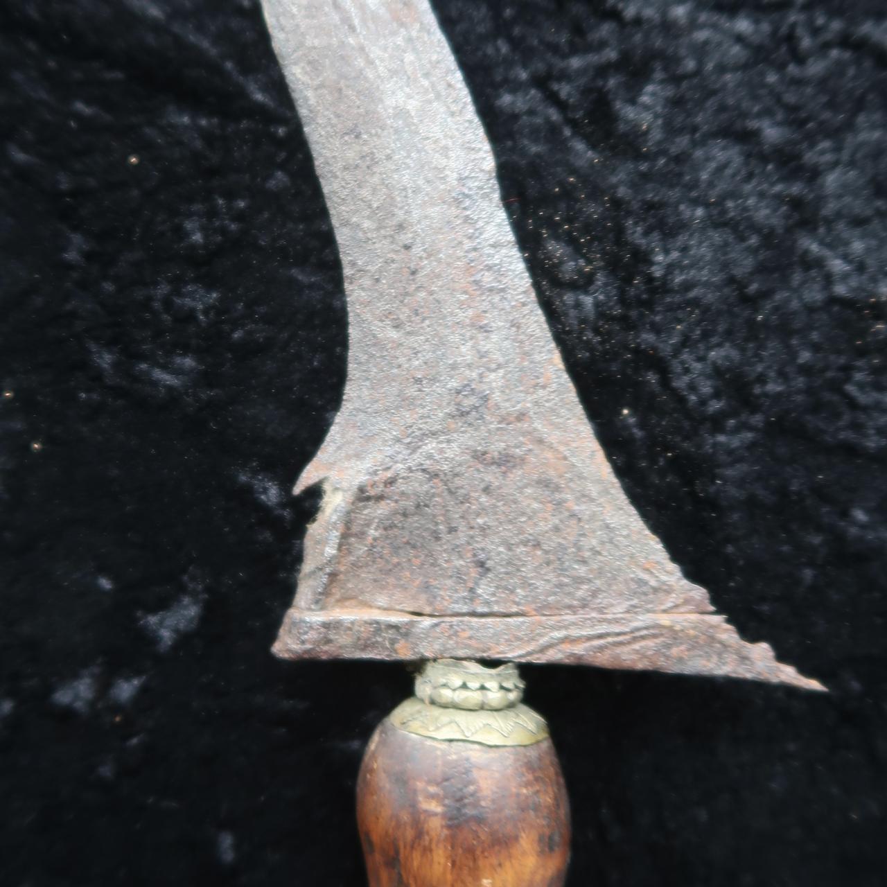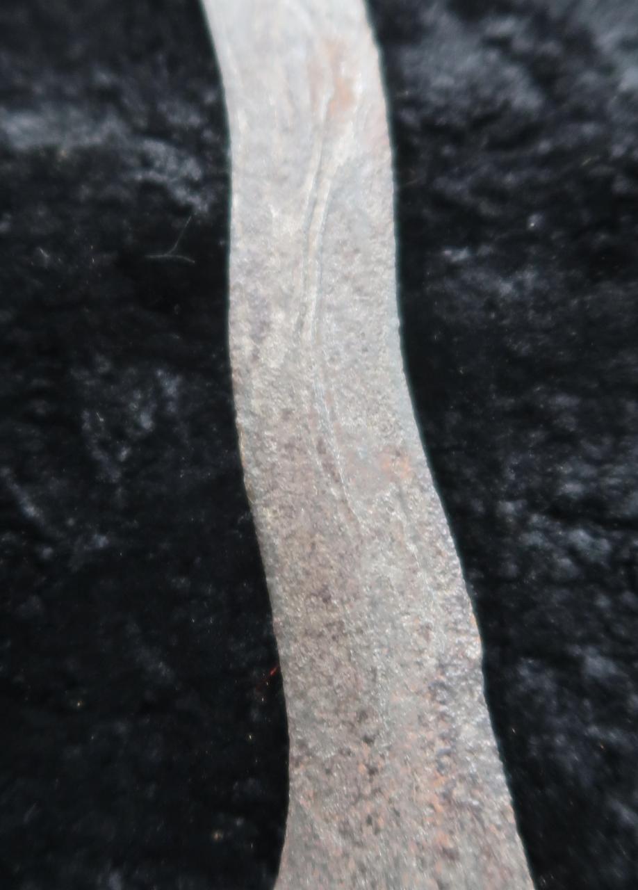 After lurking for the last six months I picked up this 9 luk Keris yesterday. It's I need of some serious TLC. It sure can use a good cleaning of the rust. I don't know a lot about it what I find interesting is that the wilah is standing in an angle from the Hilt. The Warangka is a model i have seen before but don't know how it is called. And my guess is that the Keris is from Madura. There is pamor to be seen but after derusting it might be better visible. Hope someone can provide me some more info about this Keris. Thnx for now and regards Martin |