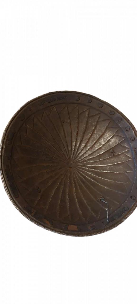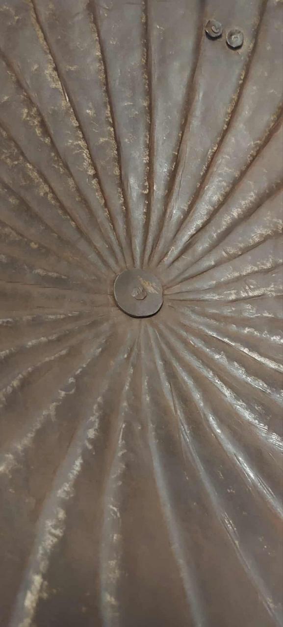 A rondal spike in the middle with a spiral motive running from top to bottom, with leaves at the base. Spiraling pattern shield with a reinforced rim. All lovely words, but to be honest i have no deeper clue as to its origin or style. Any help is once again appreciated. It would also be most helpful to get good source material on original handle or leather straps that used to be on the inside. I did find some examples but would be very interested to know how these would generally have looked like. And maybe, if it will prove not to intrusive i might get it restored so that it can be mounted with a complete armour. But that is a story for another time and a work in progress