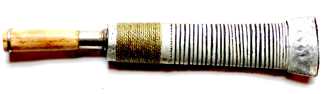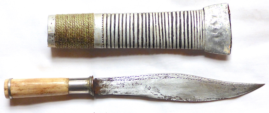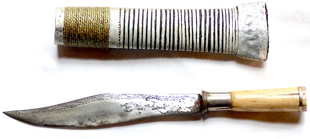 Nice example of a well made Hmong knife. The well forged and tempered blade, of typical shape, has inscribed designs along the spine and a sharp cutting edge. The bone hilt has a small metal ferrule with disc guard and a band at its end. The scabbard is covered with strips of white metal and a cord wrap at the throat. Probably dates from the Vietnam War period (~60 years old).