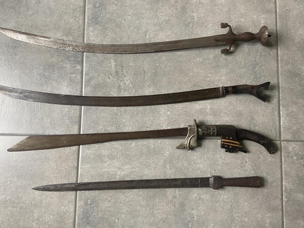 First picture has from top to bottom an Afghan pulwar, an Aceh sikin pasangan, and a Belida sword from Flores, Indonesia. Not sure about the bottom one. The Belida is quite rare (wish I had one).