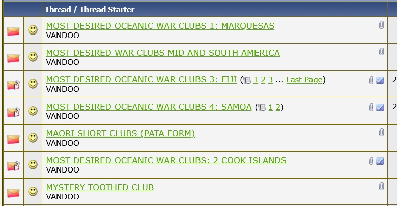 My proposal is to create a series of "Museum Pages" to document Oceanic weapons by country and by type of weapon. These pages would be for information only and not for discussion. Should members wish to discuss items on the "Museum Pages," they could create a new thread for that purpose, referencing or linking to the item on the particular Museum Page. An index of the various "Museum Pages" would appear as a "sticky thread" near the top of the Ethno Forum page.