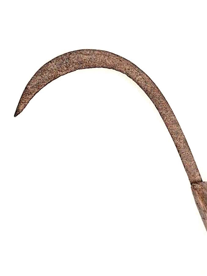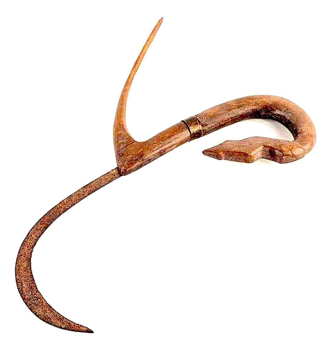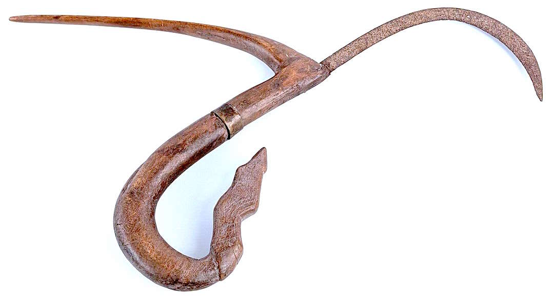 This is a nice example of the rice sickle knife that is used widely in mainland SE Asia to harvest rice. The hilt is the wooden area capped by a carved snake head. The large curved wooden section is used to capture a sheaf of stalks, which are held in one hand and then cut with the iron sickle's edge. The knife is held by the straight section adjacent to the ferrule. The collection of the stalks occurs with the wrist in a pronated position, drawing the stalks towards the reaper. The hand is rolled over to a supinated wrist position to engage the sickle and the stalks are cut below the clasped hand with a slicing motion, again towards the reaper.. This wrist-demanding and back-straining work is mainly done by women and children.