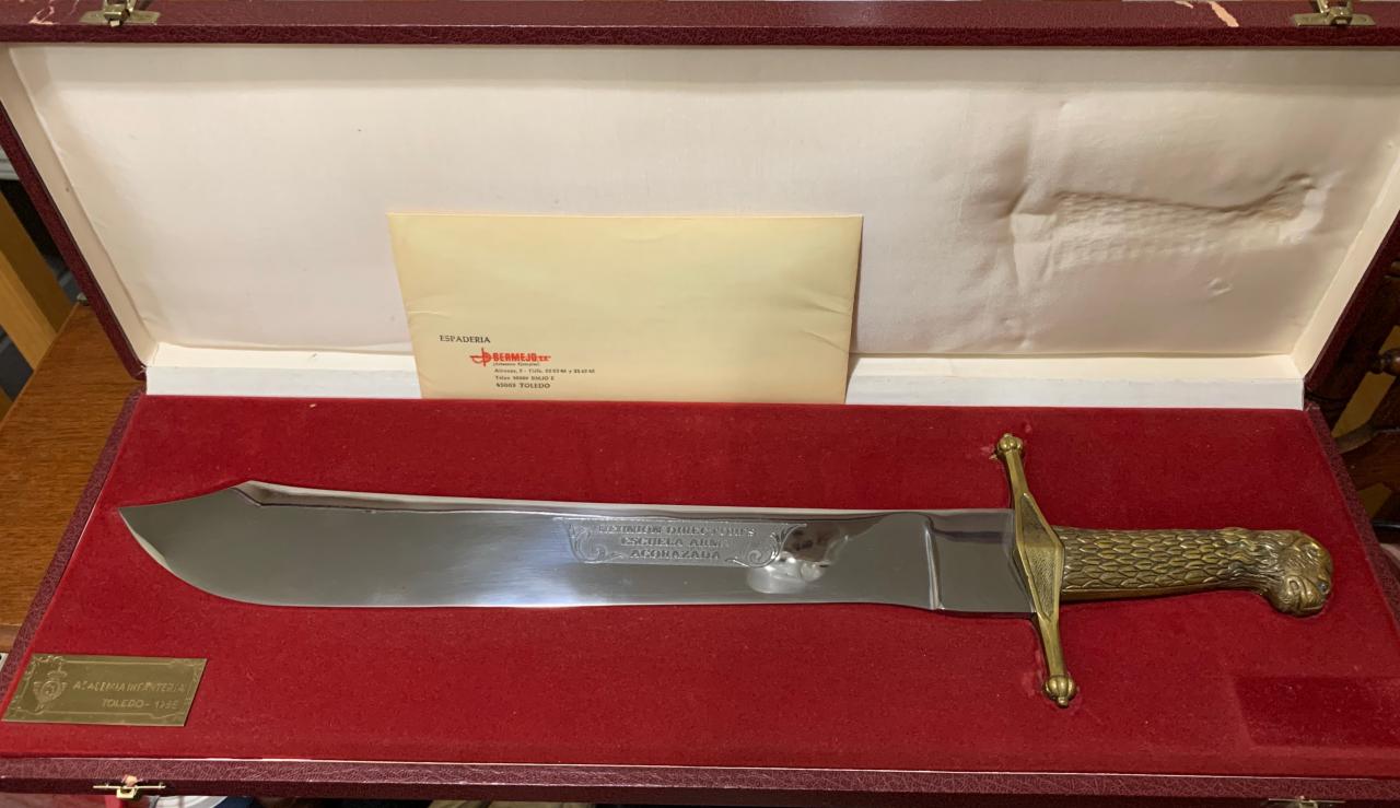 Accompanying letter states: Machete Model 1843 for Infantry Non-Commissioned Officer. This machete is an exact copy of the one that, throughout the entire last half of the past century, was used by the Spanish infantry in all its campaigns. The hilt is a copy of Roman swords and is composed of a brass pommel shaped like a lion’s head, engraved, and a crossguard in the same material with straight arms and decorative ends. The blade is wide, single-edged with a pronounced point, made of polished carbon steel. Bermejo Swordsmith guarantees that this piece has been entirely made in its Toledo workshops and corresponds to No. 13 of a limited series of 40 pieces, produced on the occasion of the Meeting of Directors of the Armored Weapons Schools, held in Toledo in 1988. (Signature and stamp) Mr. Juan G. Ojano Director. |