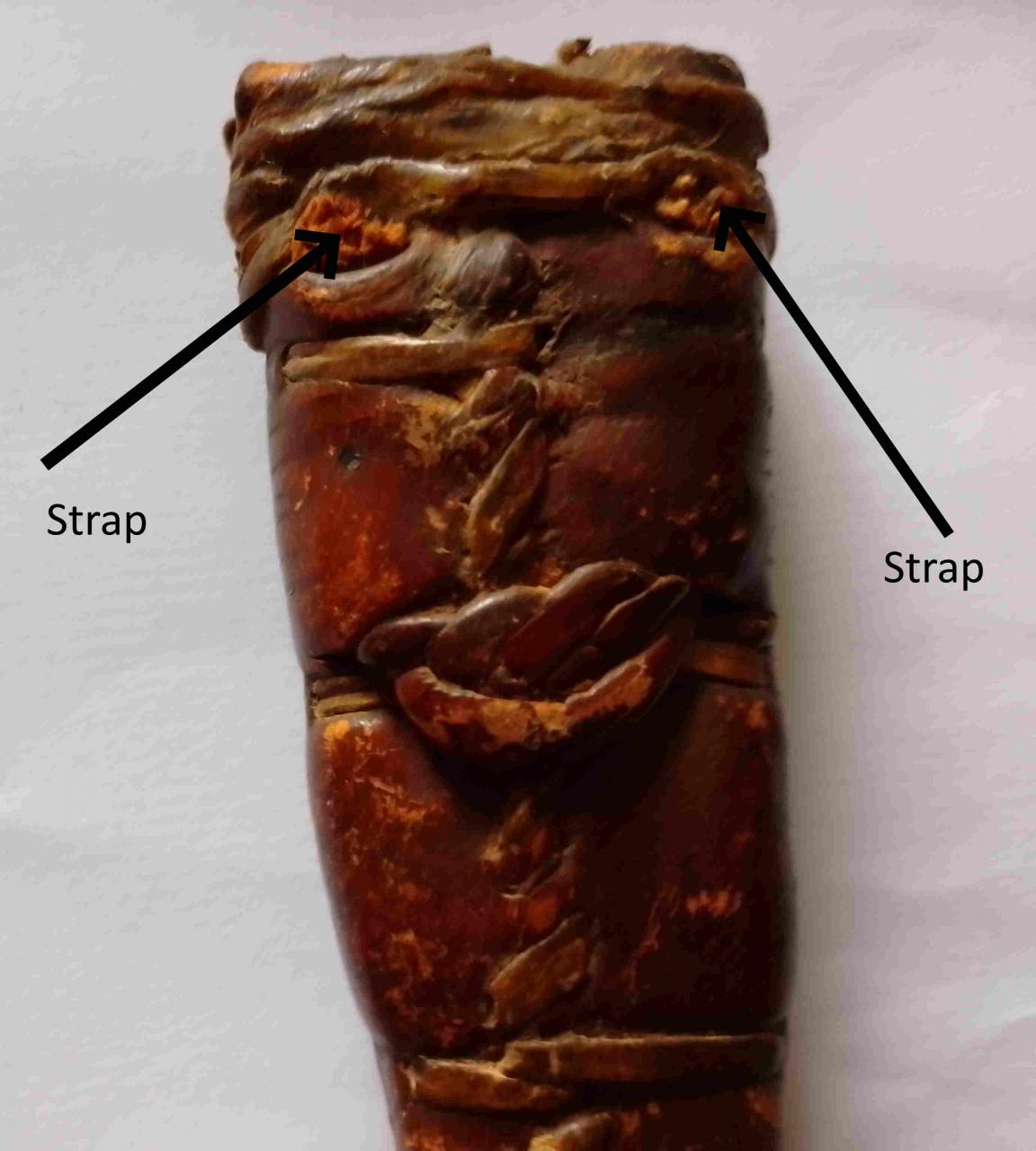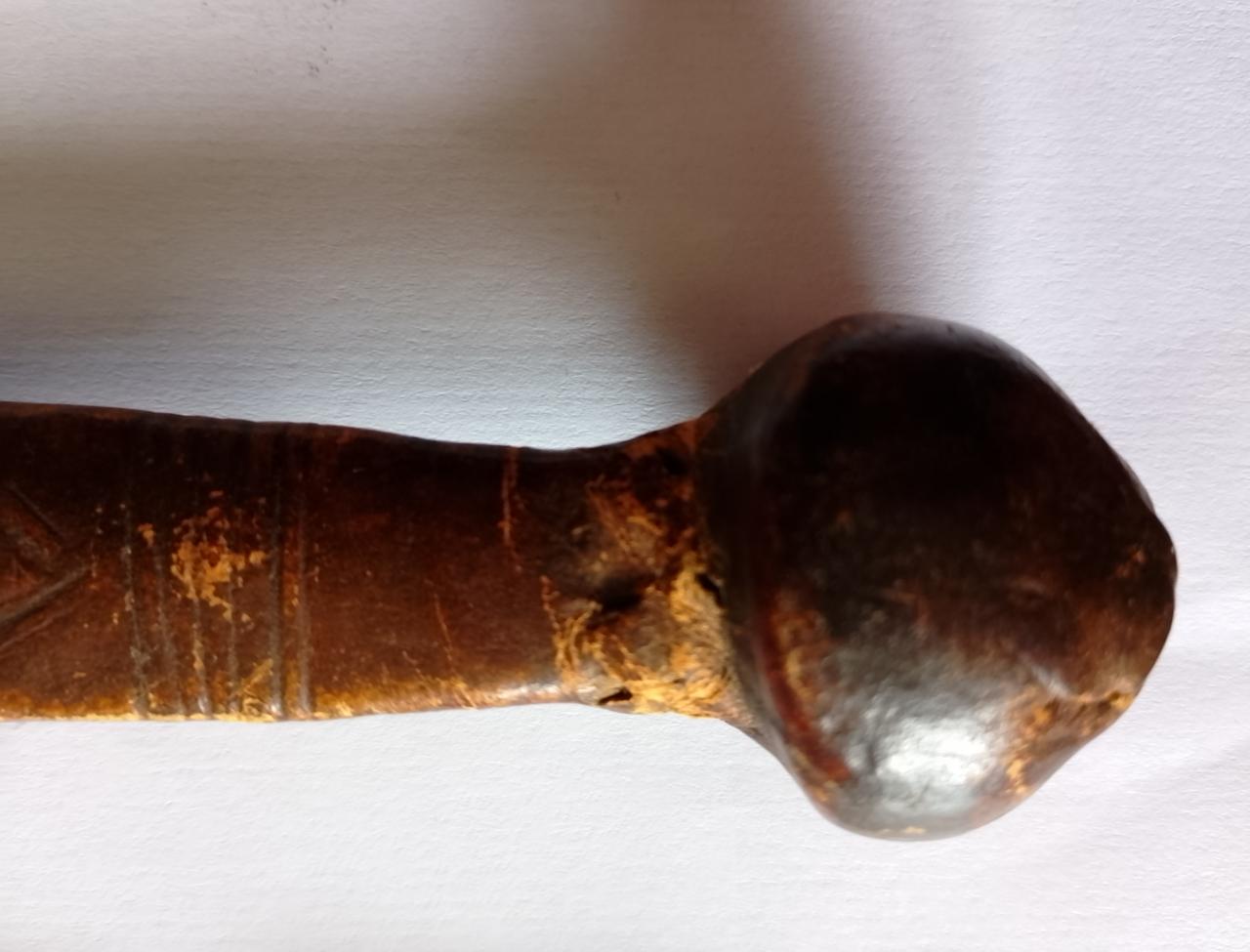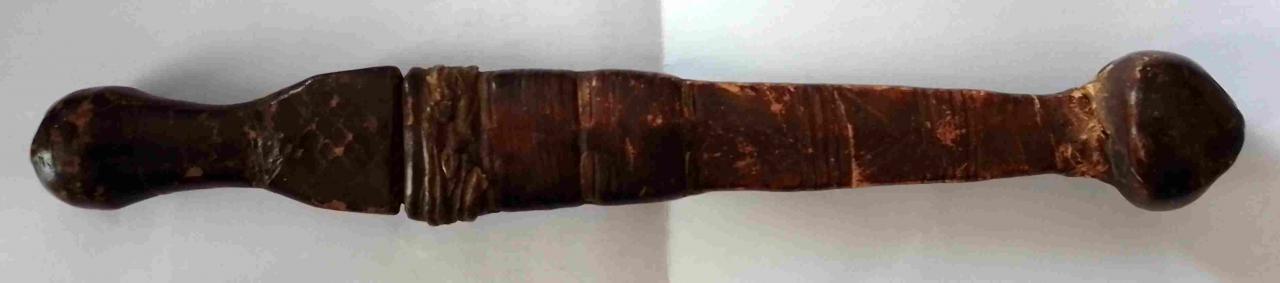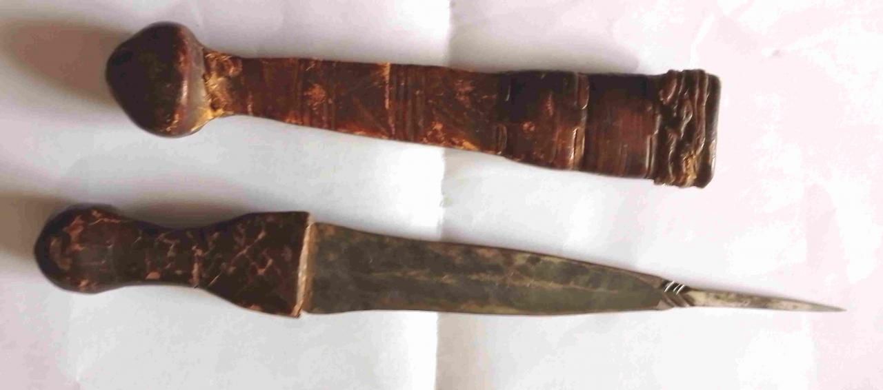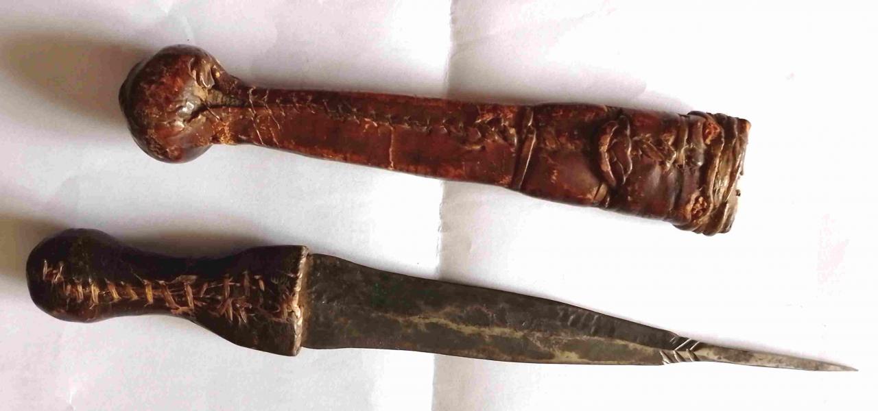 Small dagger, 22 cm long (23.5 cm with sheath), 15 cm blade. The handle and the leather-covered sheath, stitched on the reverse. The blade is handmade and very crude. on the reverse of the scabbard, the strap is missing (torn off). The ball at the end of the sheath is approximately 3.1 cm in diameter. Best regards, Mansadbar |