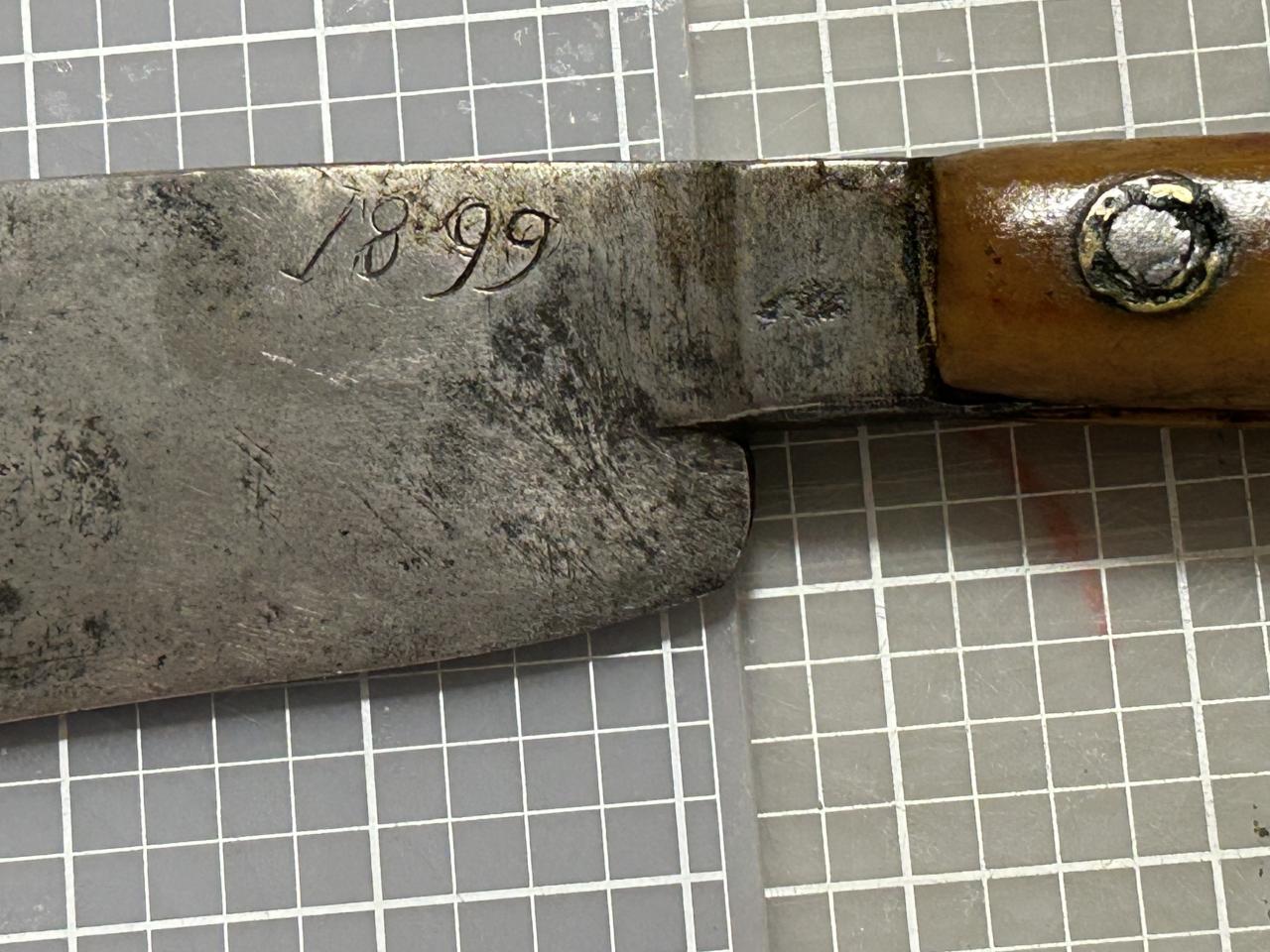 The blade of this unusual item looks very much like a traditional Piha but this example lacks many of the adornments. Also, the 1899 date is very late for these knives. Could this be a damaged older knife that had been re-handled for late 19th century tourist trade, or am I misreading the knife?