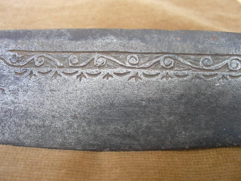 It seems basic enough, lacking the usual brass ornamentations. This is also what makes it interesting, it has intricate carving on the blade...quite deep and different from the brass inlay. Its heavy look renders it older to my eyes than the beautiful decorated examples. Could this be an earlier example than the 1820s - early 19th century - or just one made by tribes not as skilled as the Ifflissen? Any thoughts on this? Emanuel |