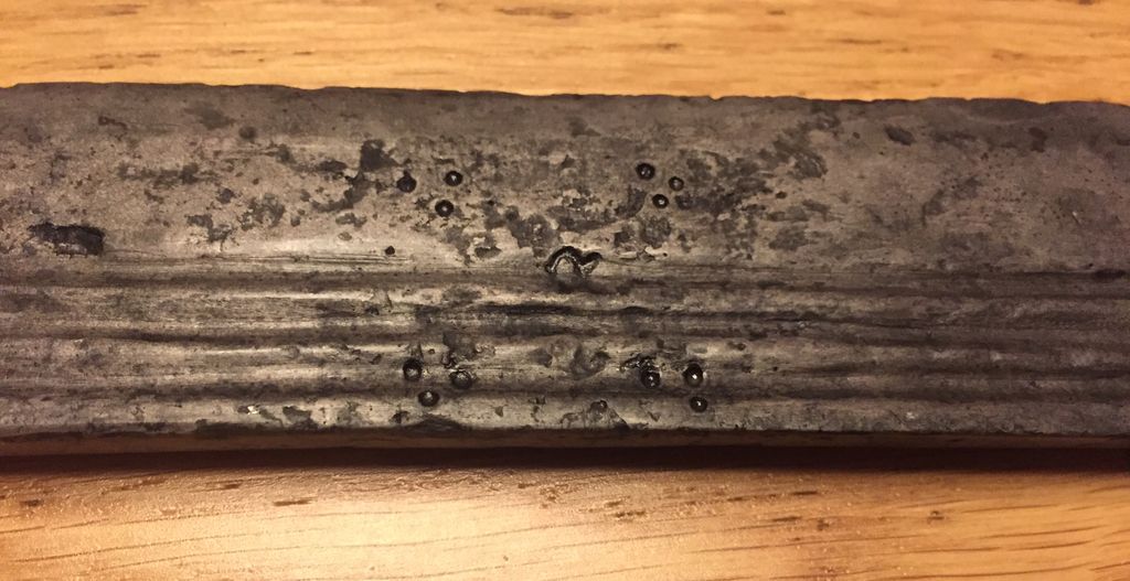 OK, here are the promised pictures of the chiseled inscriptions on the back of the blade. One of the sentences seems to contain a date (12??).